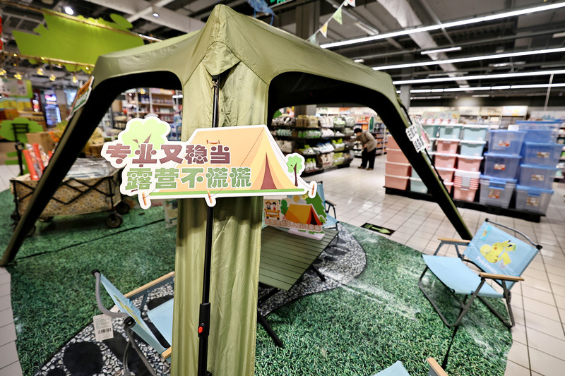 2026年3月14日,在嘉兴市南湖区各大商超和公园,市民“露营”商品专卖区购买露营商品和在公园绿地露营休闲,享受春日美好时光,“露营经济”升温。