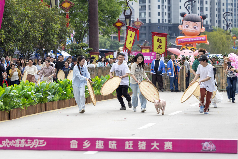 4月18日,2026年中国畲乡“三月三”趣味赶猪大赛热闹开赛,由景宁各乡镇街道和社会报名群众组成的30个“赶猪天团”闪亮登场,呆萌小猪或一路狂奔,或中途耍赖躺平,憨态十足逗乐全场。