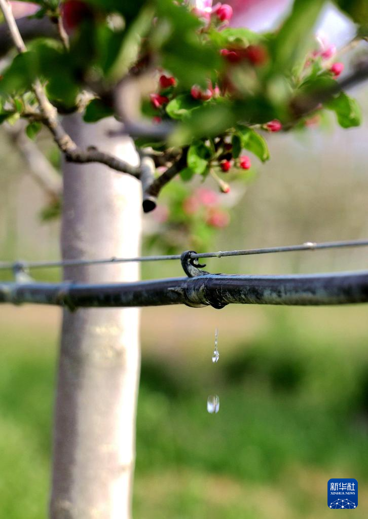 4月26日,在甘肃省平凉市静宁县城川镇有机苹果示范园,滴灌系统对果树精准施肥。