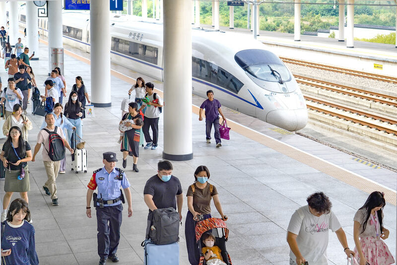 10月7日,往返的旅客在商合杭高速铁路安吉站有序乘车下车,当日,铁路国庆假期返程客流攀升。