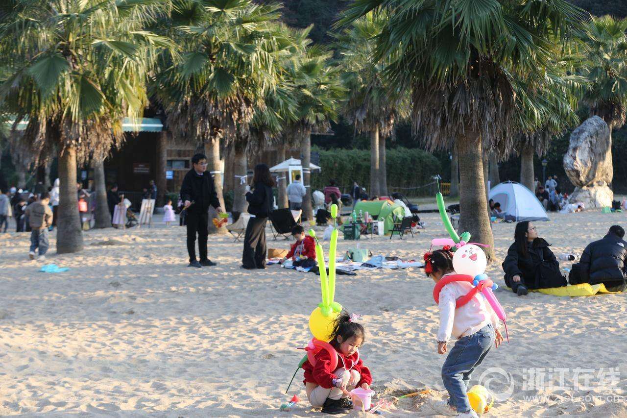 12月7日是大雪节气,浙江气温持续回升至20℃以上。图为在杭州宝寿山景区,孩子们在暖阳下戏水、玩沙子。