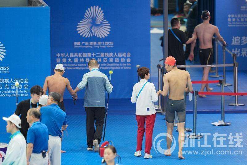在男子200米个人混合泳SM11级决赛后,参赛队员在教练的协助下退场。