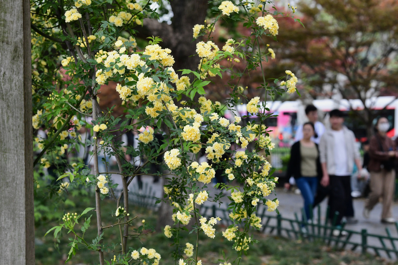 4月6日,杭城气温攀升,恍若“初夏”。西湖畔黄木香花盛放,或“独树一帜”,或垂挂廊间,花色温婉可人,让游客心旷神怡,醉入花间。拍友 里尔 摄