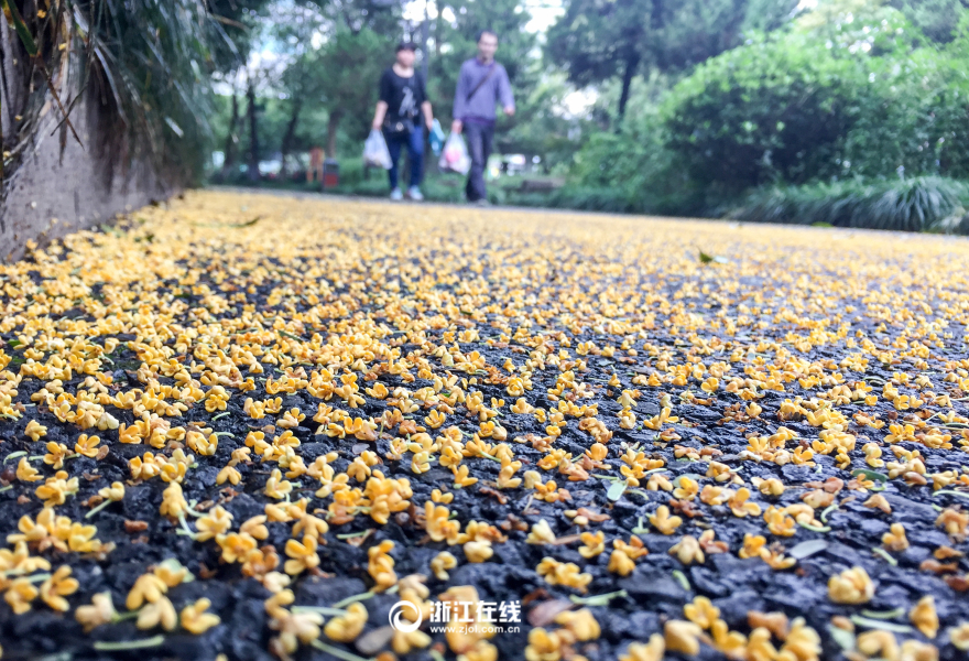 10月8日,寒露时节,清晨一阵细雨过后,杭城街头不少桂花被雨水打落,路边满地“金黄”,花香一片。